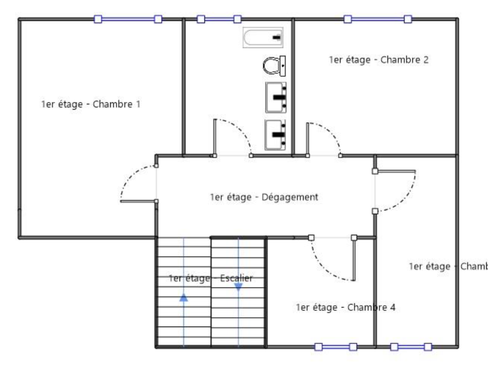 – au 1er étage de quatre chambres de 9m², 10.50m², 10.50m² et 12.50m² et d’une salle de bains avec WC intégré